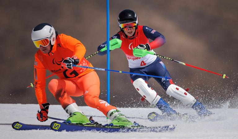 By the time our video call connects, the two are seated shoulder-to-shoulder on a sofa piled high with cushions. Both wear ParalympicsGB kit (Fitzpatrick in red, Guest in pink). A window behind them reveals a crisp bluebird day and a glimpse of the white peaks of the Dolomites.